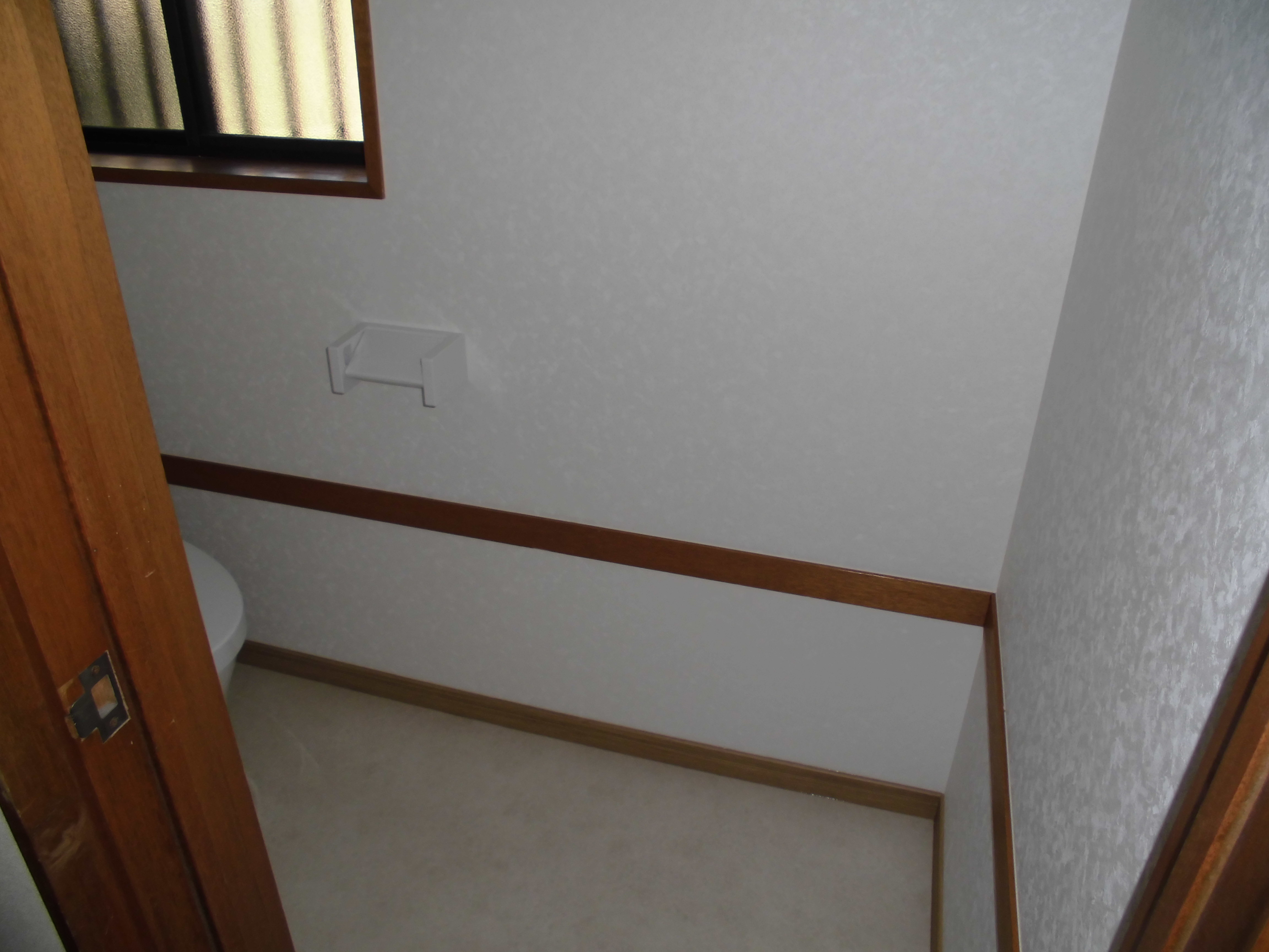 施主様が洗面化粧台が付く壁面が多少見えなくなりますがアクセントの違うクロスを貼ることで見た目の良さをアピールしました。